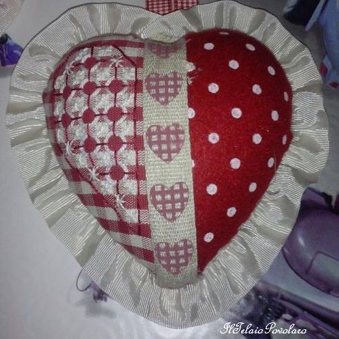 Ecco un'altra idea, .... questa è di Federica Ausilli. Quadretti e pois uniti a qualche passamaneria tutto all'insegna del bianco e rosso, rendono la broderie suisse molto festosa!! In questo caso, sempre al posto dell'imbottitura, si può usare mezzo cuore di polistirolo e la rouche che lo contorna lo rende più imponente